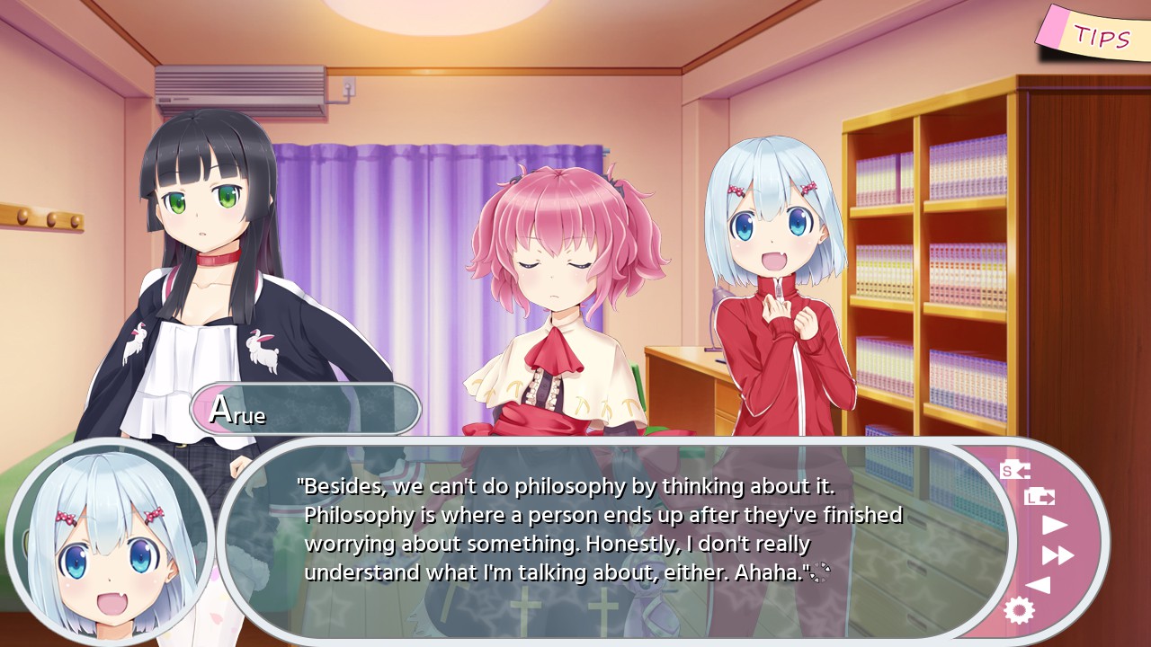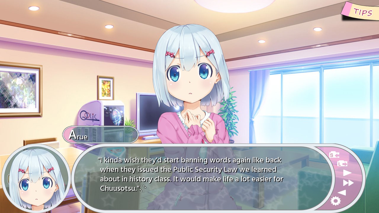 It’s against this backdrop that the game introduces us to Marisugawa Arue, an airheaded chuusotsu girl. She comes from a poor family—no father, and her mother’s Seal allows her to work only part time—and she dreams of becoming a well-paid government employee. Unfortunately, a lengthy hospitalisation and a tendency to get distracted by manga ruined her study efforts, and she ended up failing the Compatibility Exam.