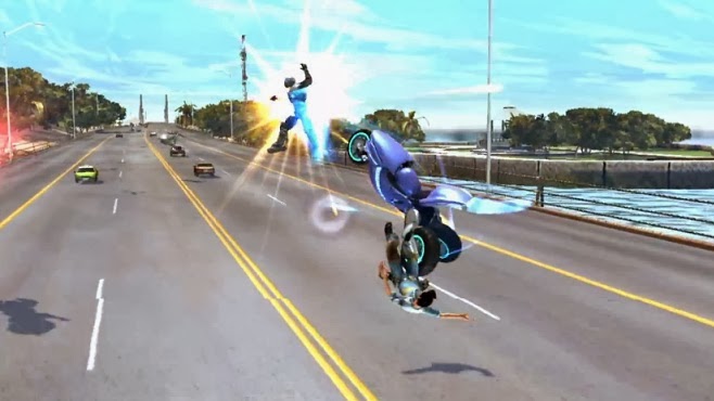 Your motorcycle, I.R.I.S., has a variety of attacks available to her, which is handy since you will spend as much time fighting enemies as actually racing down the road. It is an interesting formula that hearkens back to older combat racing games like Road Rash, but does not handle the two elements nearly so seamlessly. Here when you are fighting, that is all you are worried about. You can string together melee attacks with I.R.I.S. that are quick but weak, or use Pablo as a weapon who does more damage but swings more slowly. During these segments racing navigation is just sort of ‘handled’ by the system.