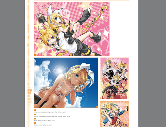 Four days in, now! Over the last couple of days we’ve looked at the fan art books covering Megurine Luka and Miku herself. There was one other book produced in this little series; a book of fan art for both Kagamine Rin & Len.