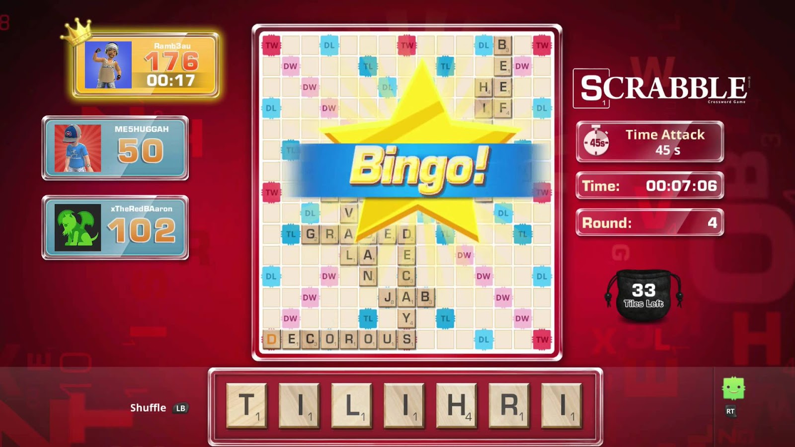 Scrabble is a great brain teaser for people who like word games. The AI difficulties create a playing field to suit just about anyone’s level of expertise. Very easy should amount to a win for most people, as the AI puts together strings of three and four letter words with no real concern about point multipliers. The very hard opponents will stack long words in parallel to yours and hit several multipliers at once, racking up points at a breakneck pace. The ability to have two to four players as well as online and local multiplayer rounds out a package that brings very few bells and whistles to the classic game of Scrabble.