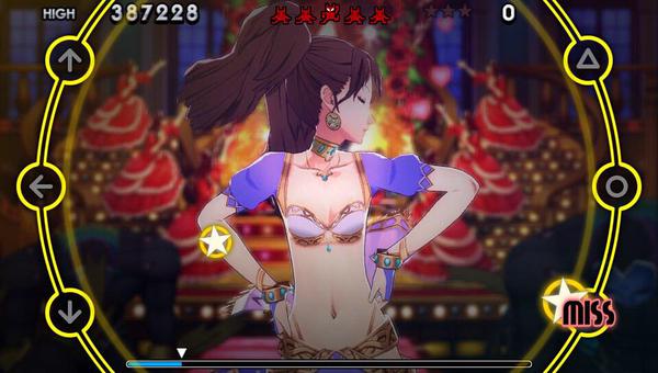Performing well in stages earns cash, which can be used (primarily) for buying little bonuses and additional costumes. That’s nothing we haven’t seen in other games before, but it’s a task that I couldn’t tear myself away from… at least until I had unlocked the costumes for Risette, anyway. See, Persona 4: Dancing All Night also gets the fan service just perfect, and let’s face it, at this stage of the overall franchise it’s the most committed fans the developers need to be appealing to, because they’re not going to be pulling in so many new players. Fan service in that context was mandatory of the developers, and they nailed it. Risette is one incredibly sexy virtual lady. She’s meant to be, of course, as the personification of Japan’s general idol culture, but the developers really ratchet it up here. Her belly dancer’s costume, especially, is a sight to behold (and then some).