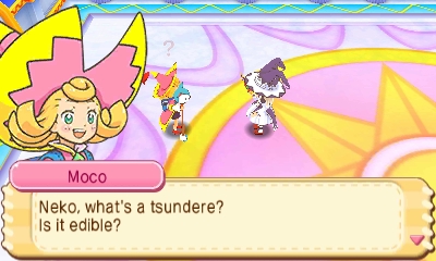 The dynamic between them results in some wonderfully cheeky script writing that is a definite highlight of the entire experience. Moco’s blindly cheerful disposition works brilliantly when juxtaposed against the judgmental Neko and her mentor. Although the cast is reasonably small, even side characters such as a giant blue dog manage to breathe life into exposition-heavy sequences with gags about doggy hair loss from vigorous petting. As the genre is wont to do, this pleasantly light-hearted fluff winds up being the ambassador of a greater a coming of age story centred on Moco’s growth (which does justify her stereotypically ditzy behaviour a tad). As a side note, I have to give props to Aksys Games for providing a localisation that, although designed for the kids, acknowledges the otaku appeal this game has by respecting the original character names working in clever nods youngsters will likely scratch their heads at.