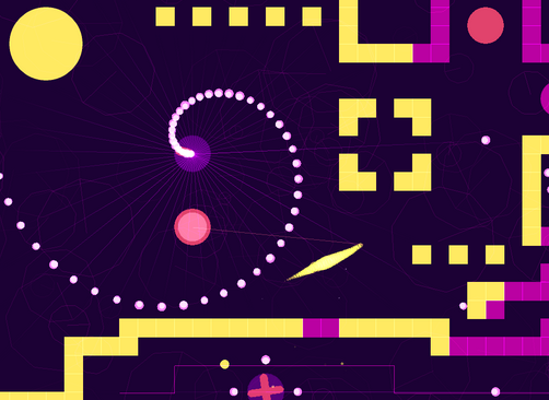 The overall idea of the game is far simpler than the execution. The on-screen avatar (herein referred to as the “Soft Body”, as it looks like one of those soft, fluffy, pipe cleaner like ferrets on fishing wire you use to play with your cats) moves around the screen, trying to change all that is purple into yellow. Once everything is changed to yellow, the game progresses. As time goes on, this task is made more difficult due to the aforementioned bullets and missiles being fired at the Soft Body. Once that is conquered, the Soft Body then gets a “Ghost”, which is where the twin stick action comes into play. The Ghost is another soft, fluffy pipe cleaner like object, except this time it’s purple, and can travel through walls and eliminate enemies by touching them. For the most part, the Ghost resides within the Soft Body, giving it the ability to kill foes (but not travel through walls). Utilising the right stick frees The Ghost from its prison to unleash all kinds of death-touching. Controlling both these characters is an often harrowing experience that is sure to get the mind working, but it is done in such a great way that frustration rarely got the better of me.