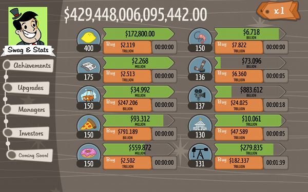 And so on and so forth. There’s not presentation or strategy to this. There’s no way to lose money. If you need more cash, just press the profit button and wait for the wait bar to fill up. There’s no presentation to it either – aside from the purchase menus, all you’re going to be doing is looking at a static list of your “businesses” as well as the bar that fills up every time the profit button has been pressed on them.