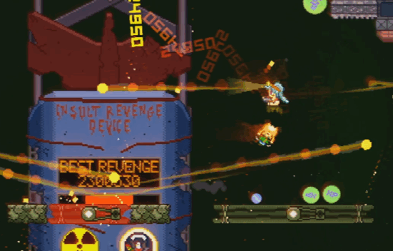 Of course this is all ridiculous, and it’s meant to be. It however manages to set the stage for the chaotic combat that sees you taking control of a soldier who has the sole job of escorting the bomb as far as you can. Combat is centred on jumping and shooting with loads of crazy power-ups that attack the Molemen and their allies in a variety of ways. Everything is drawn in a pixelated sprite aesthetic that fits the feeling of the title quite nicely, with lots of projectiles, explosions and critters all presented in brightly flashing colours.