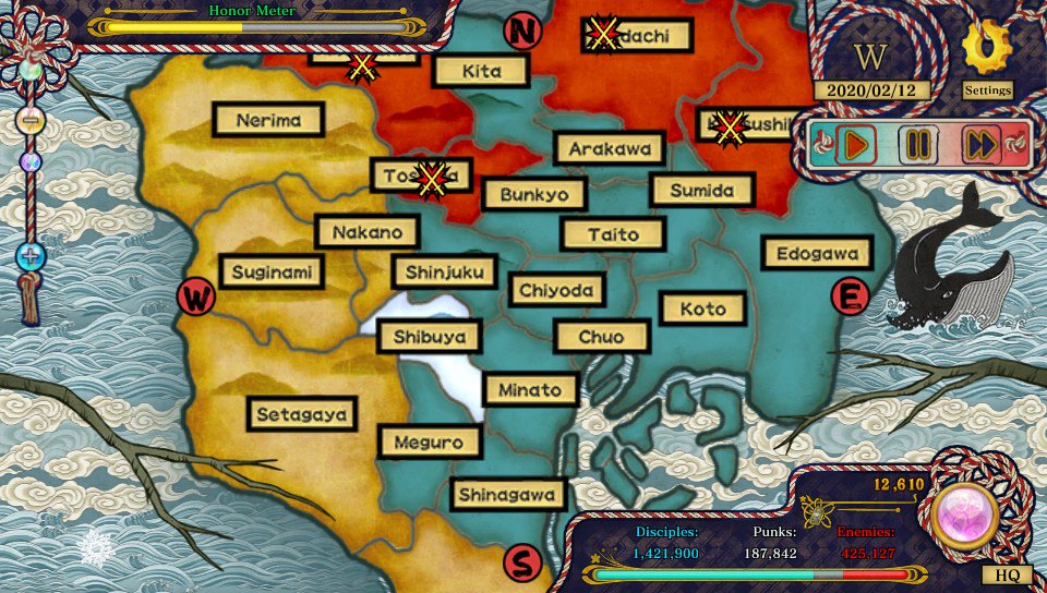 Tokyo Tattoo Girls is a casual strategy game, and as I alluded to at the start, the best comparison I can think of is to compare it to Plague Inc. In the game, you can’t actually directly order troops around; they’ll do their thing by themselves, while you watch the action unfold on the main map. What you can do is issue commands from a menu, which will affect how effectively your soldiers do their job. So, for example, the only way to get a “game over” in the game is to run out of “honor.” Every time your units invade a ward, until they’ve completely conquered the ward there’s a risk that the battle between the gangs will turn into civil unrest, which results in damage to your honor rating. You can use your character’s influence via the menu to calm at-risk areas down, or to focus recruitment of new soldiers on your side into a specific ward, hoping to capture it more quickly.