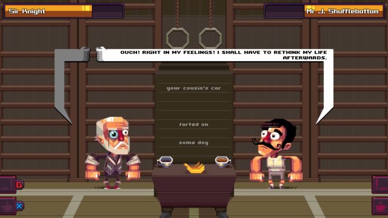 While the game is called “Insult Simulator”, one need not concern themselves with the likes of F-bombs here. Instead you get insults directly borrowed from the Pythons, such as the aforementioned elderberries classic or hamster based attacks. There are also more modern variations along similar themes, such as “your aunt still uses Windows Vista” or “your sister sucks at Overwatch”. The latter goes to show how some of the phrases generated while playing Insult Simulator cannot qualify as insults, or may even be regarded as compliments (that is certainly my opinion with regards to certain highly successful MMOs). It’s all part of the game, and your insults will be assessed for punch accordingly. That is to say, not only will you need to come up with a grammatically accurate sentence to hit your opponent, you will get much more the punchier the insult gets.