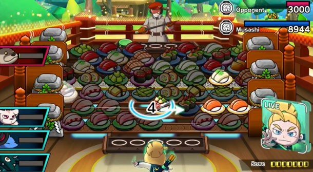 Sushi Striker is delightfully frenetic, and certainly the most original spin we’ve seen on the “match-3” puzzler in quite some time. Plates move across the conveyor belt at a good clip, so to get the really good combos you need to think and react quickly. It’s also an oddly meditative game because your opponent will be constantly attacking you, and it’s easy to get distracted by what’s happening on the other side of the screen. But you need to resist that and really learn to focus on what you’re doing. There aren’t too many games that are able to force you to concentrate quite like that. It’s a nice touch.