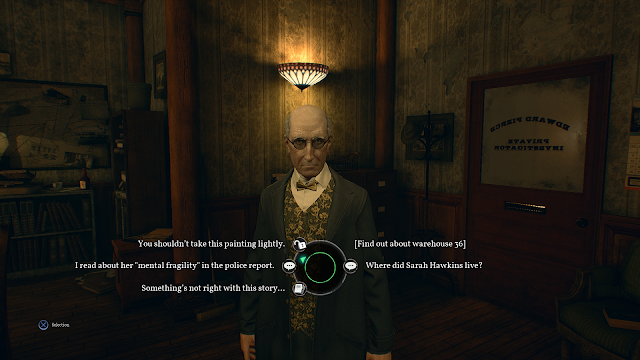 Pierce is incredibly skilled at reconstructing crime scenes, something that comes in handy time and time again. He enters a misty haze of thought and focuses on the item that tells the next part of the story he is trying to uncover. He can practically see people, their movements, their interactions. The best part? It’s extremely clear when he is able to do this, as a message pops up stating how to enter a reconstruction scene. And it’s extremely clear when you’ve done all there is to do, as a similar message pops up indicating how to leave.
