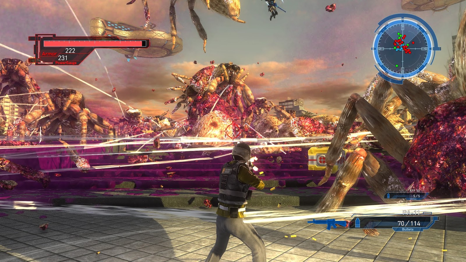 What’s most impressive about EDF 5 is the sense of scale it offers. When a giant, city-sized flying saucer appears overhead, it looks like something of a size and power that makes the Independence Day alien ships look amateur by comparison. When you launch yourself into a horde of ants and start blasting away, the way their bodies slowly fall to pieces from the bullet storm is not only visually spectacular in how grisly it is, when all you can see is the movement of giant ants all around you, but it’s also viscerally entertaining. It’s also almost intimidating how much there is in this game. Levels are short and over after just a few minutes, but there is something like 110 of them, and the game is still introducing new enemies and making sure the game remains fresh right to the end of that list. It’s not that long because of padding. It’s that long because the developers really did have that much to share.