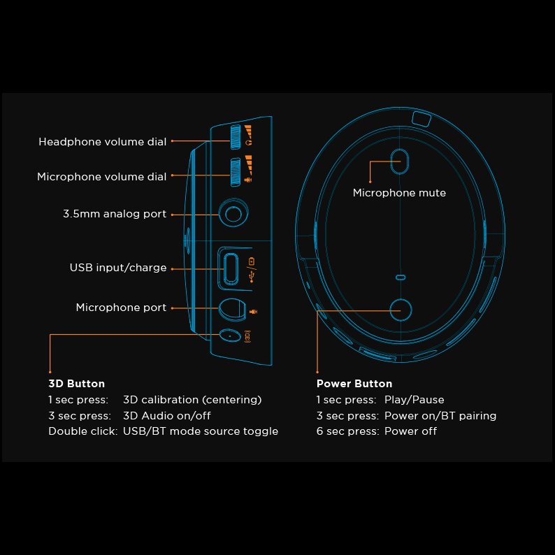 As far as features, the Mobius headphones have everything you could want conveniently on the left headphone: in/out volume control dials, plug-ins for the detachable mic, USB-C and standard audio jack, microphone toggle, power button (tap twice to Bluetooth sync) and 3D button. The 3D feature is what intrigued me most; I haven’t had an opportunity to try such a headset, and at a glance, “3D audio” sounds like a bit of a gimmick. After all, audio in 3D games are already mostly 3D by way of the software, so what could be different?