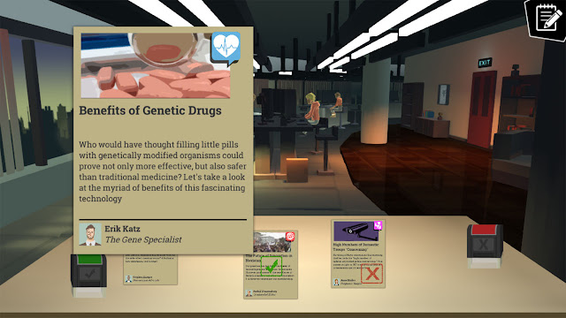The other issue is that the binary decisions that you need to make simplify issues down far too far. For example, you might decide to champion universal healthcare, but if you flick that particular switch on, the lineups at medical centres instantly become unmanageable in their length. Headliner comes across as a game of hyperbolic strawmen – to adopt a position is to see the world fall into chaos with the consequences of that position. Not only is this disingenuous debating form – and make no mistake, Headliner is “simulating” a range of critical debates to our society – but it also makes for very clumsy gameplay. Papers, Please was subtle enough that you couldn’t be sure of the full implications of what’s about to happen if you make a particular moral decision. With Headliner, you make every decision knowing full well how that’s going to play out the day after the newspapers hit the stands.