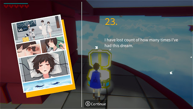 Lastly, praise needs to be given to the game’s aesthetic. The low-poly environments and abundance of bright primary colours adds to the world’s dreamlike appeal, and whether docked or handheld, the game is a marvel to behold. I particularly enjoyed the use of light in the protagonist’s sword attacks. The music also complements the soothing, ethereal tone effectively – it is a sparse piano score reminiscent of Breath of the Wild’s soundtrack, perking up in moments of tension and accompanying the protagonist through his walk across the game’s world.