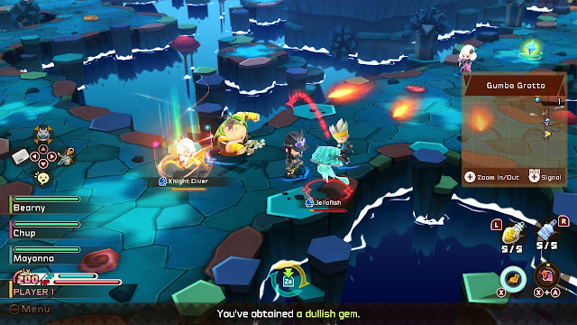 Snack World is an action roguelike with a heavy emphasis on both multiplayer action and humour. Or, at least, an attempt at humour. Let’s start with that, because it’s so pervasive everywhere. Admittedly I fall outside of the target demographic for Snack World’s humour, because the game is pitched at much younger people, but it simply never got me to laugh. The promise was for a fourth wall-breaking, meta-heavy narrative, but that really only translates into shallow swipes at genre conventions… which the game proceeds to indulge in full. I firmly believe that fourth-wall breaking humour only really works when it aims to deconstruct and subvert the expectations of the genre. When it’s done well it can be remarkable. For a good example, look at comic book hero, Deadpool. Deadpool’s effectiveness as a character is precisely because Deadpool pulls at the threads of the comic book medium while making its jokes, and resists indulging them. Snack World isn’t really self aware. It pretends to be, but ultimately it really wants you to accept it uncritically. In the end it’s just as well that Snack World isn’t overly focused on the narrative, because it’s got some very confusing disconnects going on within it.