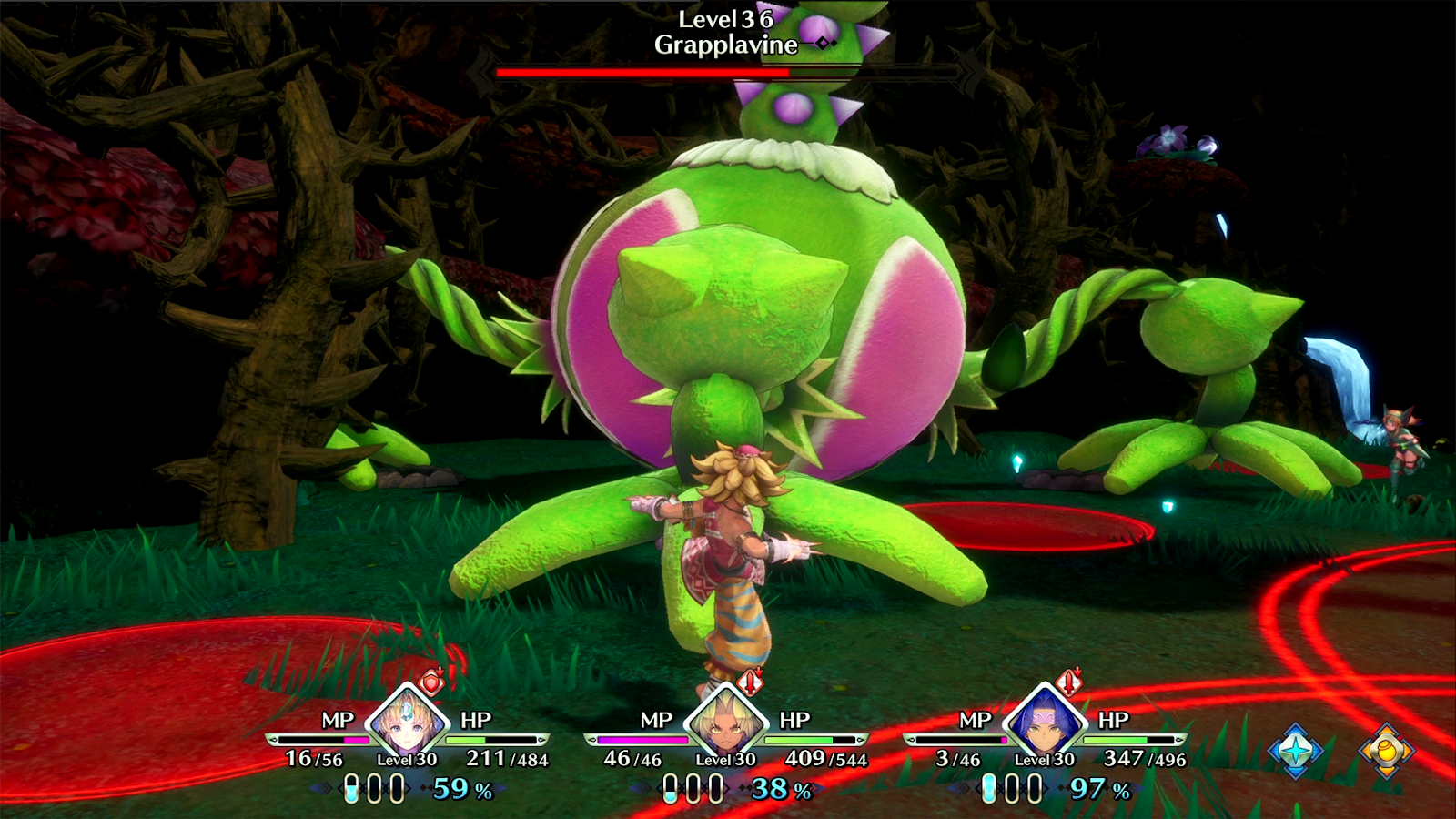 The combat system has made the move to three dimensions nicely. Unlike many other SNES-era JRPGs, the Mana series always made use of an action combat system, and players have access to normal and strong attacks, a dodge, a super attack that consumes energy that players collect by defeating enemies, as well as (eventually) magic and other powerful abilities. Some enemies don’t offer enough visual cues to properly time dodges, but then Trials of Mana isn’t designed as a hardcore action game, so taking some damage from enemies along the way is fine (that is, after all, why you collect plenty of healing items along the way). What’s important is that the system is smooth and responsive, and when the enemies are about to launch their more truly powerful attacks, you are given fair warning to get out of the way first thanks to an MMO-like projection of the area that the impending attack is about to land.