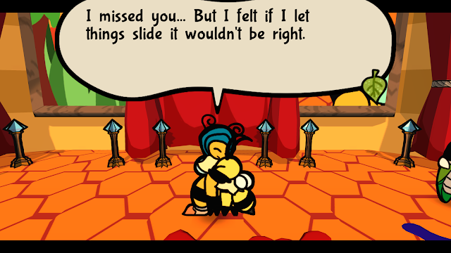 Of course the puzzle designs aren’t quite as tight or refined as we see in the Mario RPGs either. It’s close, don’t get me wrong, but little things, like aiming the bee’s boomerang to hit a switch in the distance or surprise attack an enemy, just isn’t quite as easy as it would be if it was coming from Nintendo. Using the ant character to create an ice block from dripping water takes an extra go or two because it’s difficult to instantly judge where the ant needs to be standing. Every once in a while your party will fall down a gap because movement is ever-so-slightly clumsy. None of these issues hurt the game in itself. It’s just a constant reminder that while tonally and structurally Bug Fables wears its inspiration on its sleeve, Nintendo are the masters of quality-of-life refinement and it’s hard for indies to catch that.