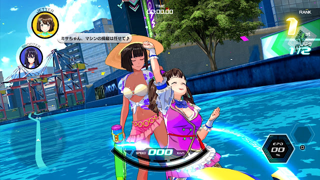 Just like in Mario Kart there are items to pick up around the tracks, and those winding tracks all have plenty of sharp turns to fine-tune racing lines and master power slides. Execute those power slides well enough and you’ll get a good boost of bonus speed, and then there are jumps and boost pads to further add complexity to the tracks. Beyond that Kandagawa Jet Girls gets surprisingly technical at times – you’ll need to raise or lower the nose of the jetski depending on whether you’re aiming for speed or control at that particular moment, and there are all kinds of strategic decisions you need to make around when to use boosts, whether to save the boost energy for a powerful super attack, and so on and so forth. You’ll be spending the first 20 minutes or so just playing through tutorials, which is not what I expected for an arcade racer.