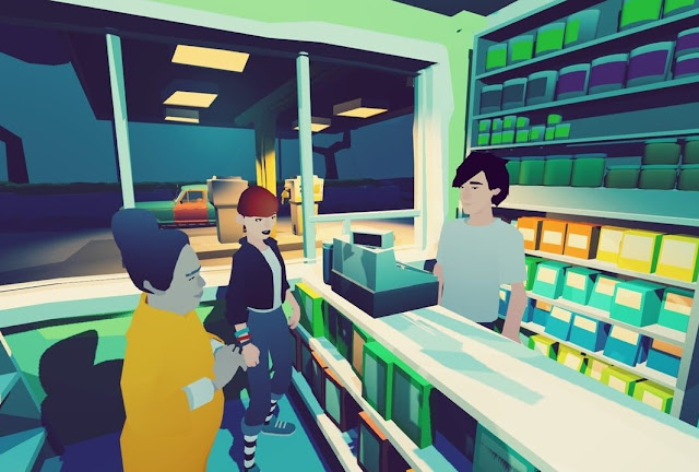 The graphical design here really shines, where the architecture and overall look of each city goes a great length to sell the sensation of place. In both the driving and visual novel segments, the simple geometric art style evokes feeling in addition to texture. Many moments made me nostalgic for the adventures I’d had in my childhood – even if it’s just the outline of mountains looming in the distance within the grey haze. There’s a marked honesty to these representations which gives the overall experience weight.