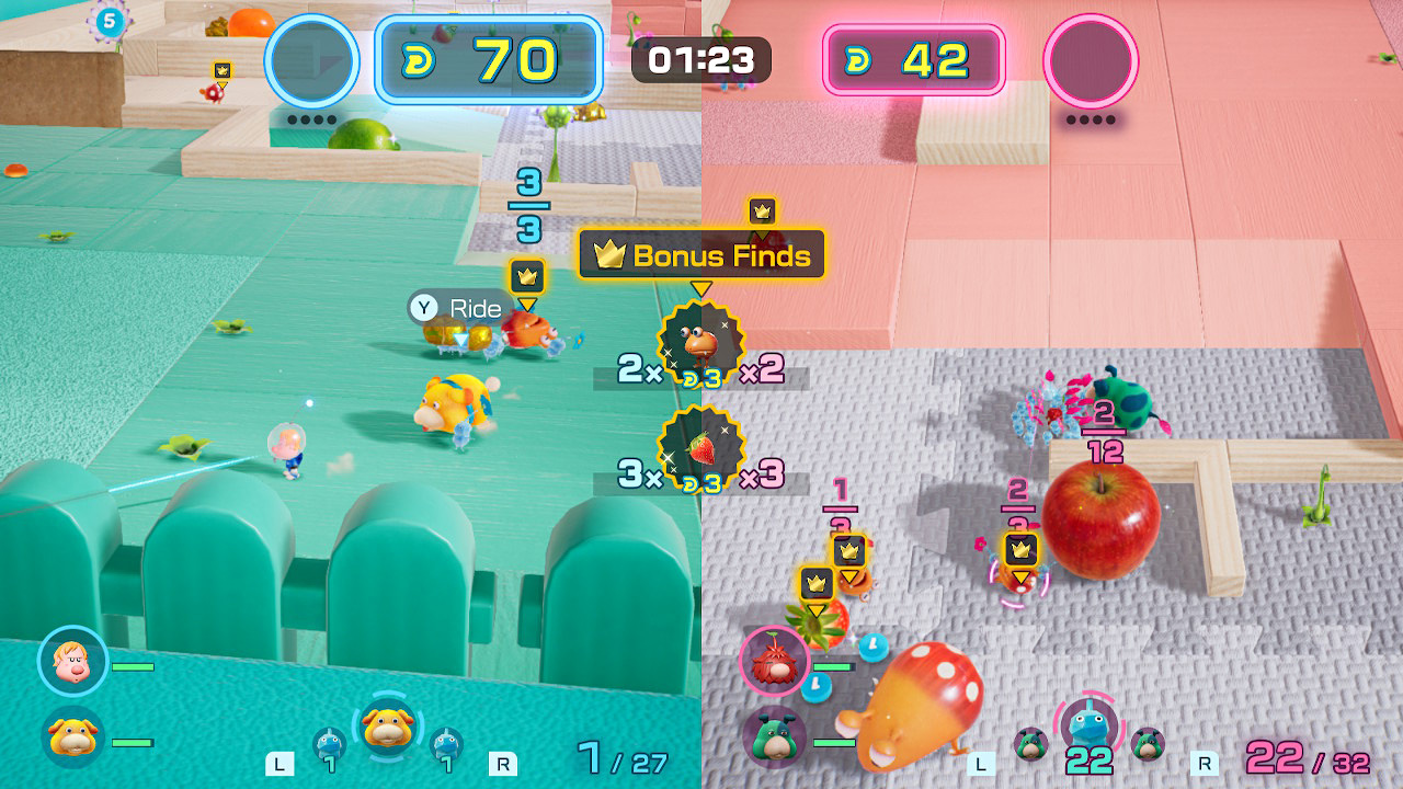 Dandori Battles are a far more pure implementation of the Pikmin philosophy. I would also have been genuinely happy to see the rest of the game removed just to focus on these. Rather than explore and solve puzzles to unlock new pathways, Dandori Battles are one-on-one competitive experiences where you need to work fast and collect resources scattered around an area faster than your opponent.