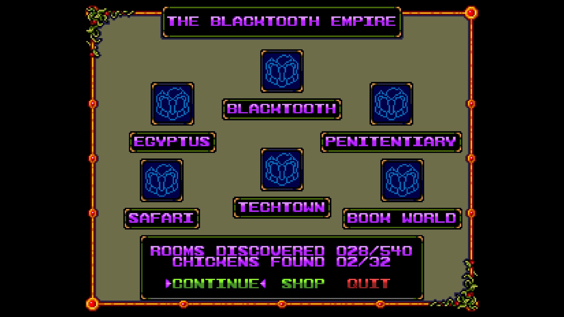 Some chickens are just a matter of lining up your jumps properly and avoiding the obvious and sometimes not-so-obvious traps to get them, while others are trickier puzzles to work out. You don’t have to collect the chickens, because the core game is still there, but you can trade chickens for additional lives, and you’ll need them.