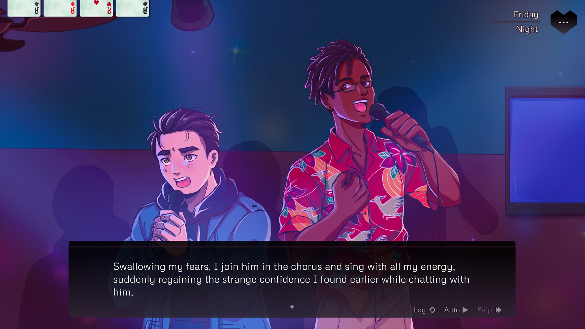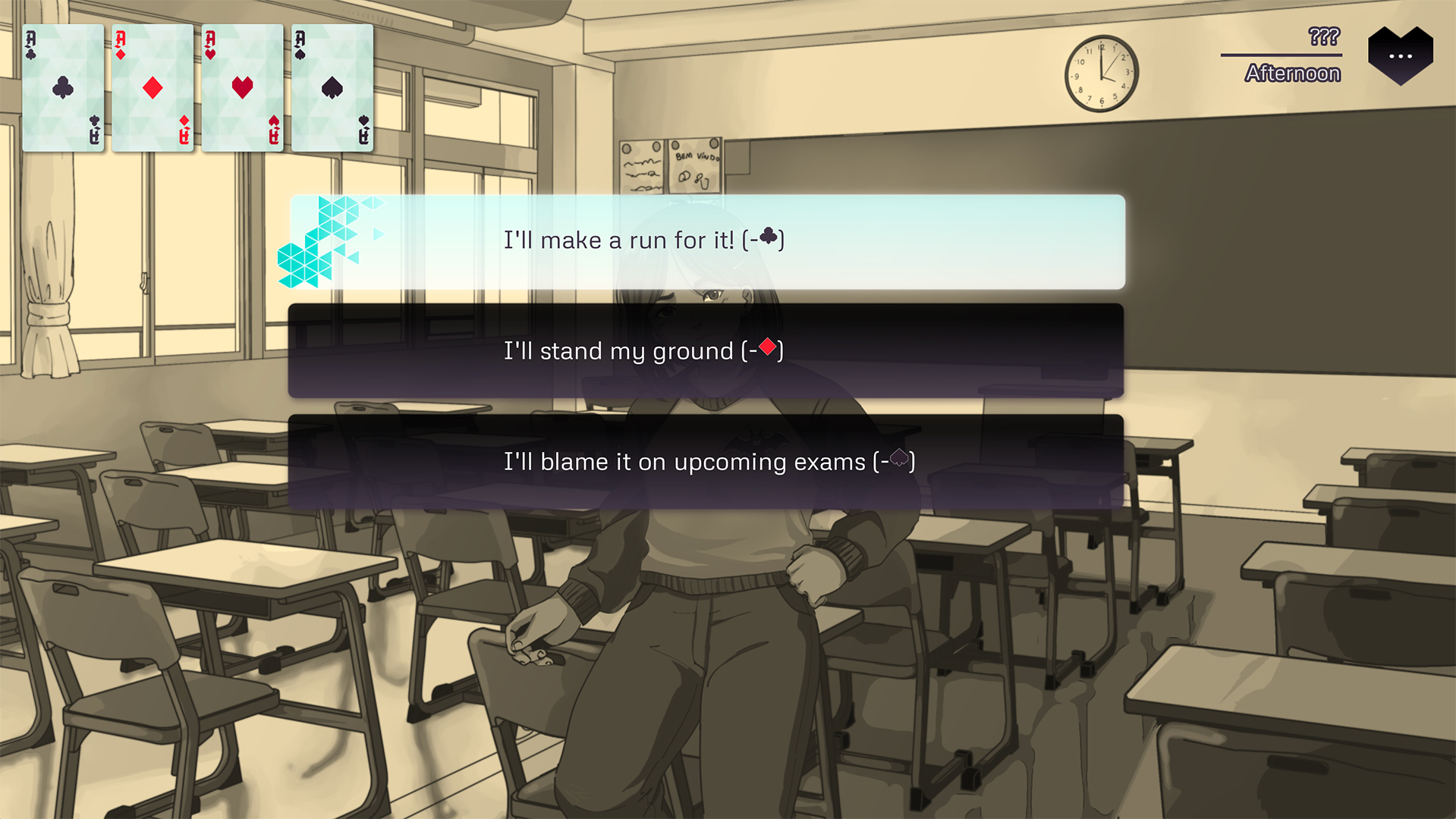WKM: Like most visual novels, the core of the gameplay in Pivot of Hearts comes from the player choosing what the protagonist does from a predetermined set of choices during key points of the story. However, in our case, we further divided these choices into two types: one that gives points associated with a card suit, and one that spends those points. The first type consists of choices about what the character wants to do with their time, who they want to talk to, and other minor decisions like that. These interactions feed them the different types of suit points, representing different “emotional energies” tied to the suits. Then, the second type consumes those points by demanding emotional investment from the protagonist, and there is always a “free” choice. This way, the most desirable choices have a cost, and the player has to strategize a bit to make sure Wen is on good terms with all the characters they like.