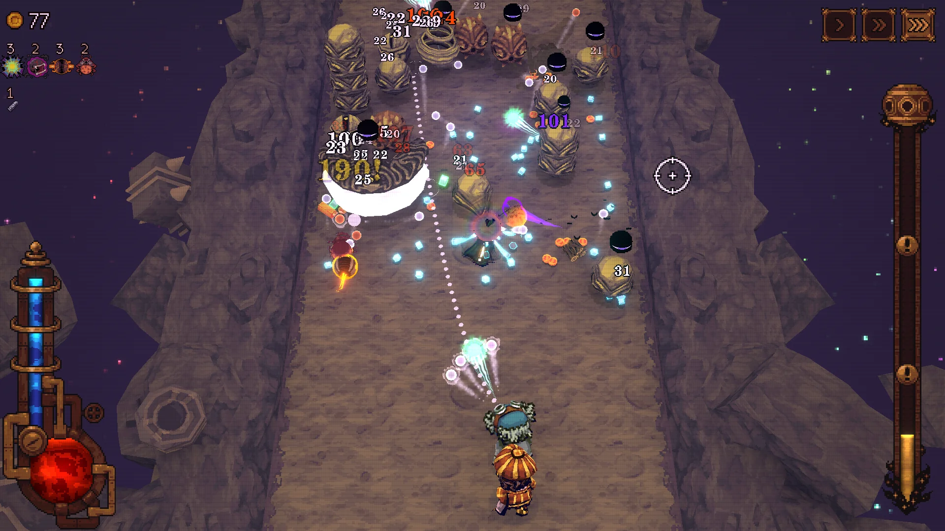 It must be hell working under such conditions, but safety concerns aside, this is a weaker side of Ball x Pit, mostly because it’s not quite as hectic and engaging. I quickly fell into a pattern of placing new buildings directly into the straight firing zone of my harvests until they were complete, shuffling them off to the sides, lather, rinse, repeat.